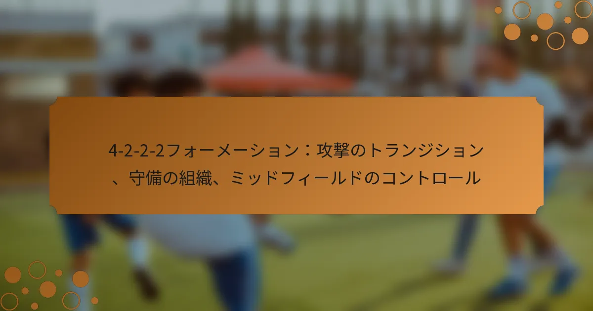 4-2-2-2フォーメーションは、サッカーにおける戦術的なセットアップで、4人のディフェンダー、2人のセンターミッドフィルダー、2人のアタッキングミッドフィルダー、そして2人のフォワードを特徴とし、守備の堅実さと攻撃の多様性を兼ね備えています。このフォーメーションは、効果的なパスの三角形とダイナミックな選手の動きを通じてビルドアッププレーを強化し、コンパクトな守備形状により組織的なカバーと迅速な攻撃への移行を確保します。